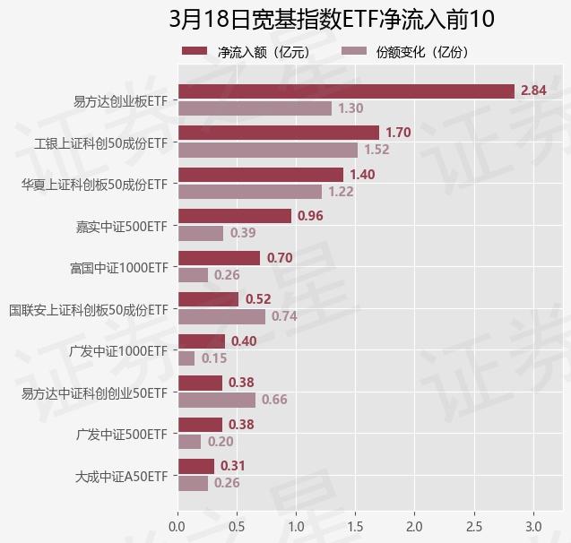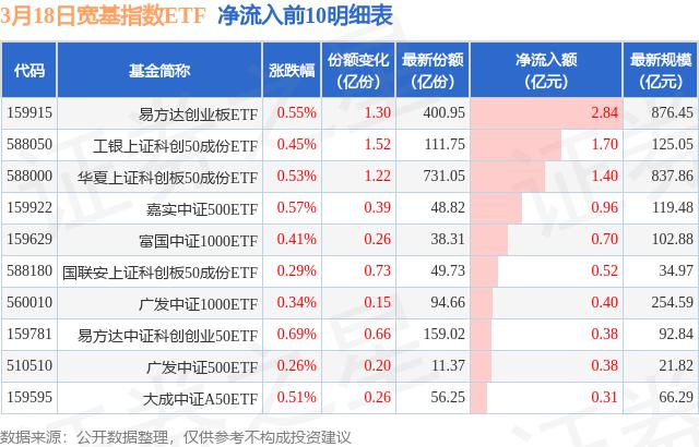 当天有 24 只宽基指数 ETF 资金净流入显示,其中易方达创业板净流入排名第一。 ETF(159915),份额增加 1.3 十亿份,净流入额为 2.84 亿元。
