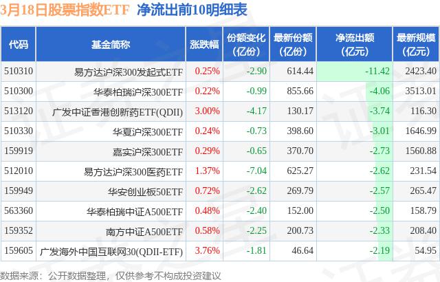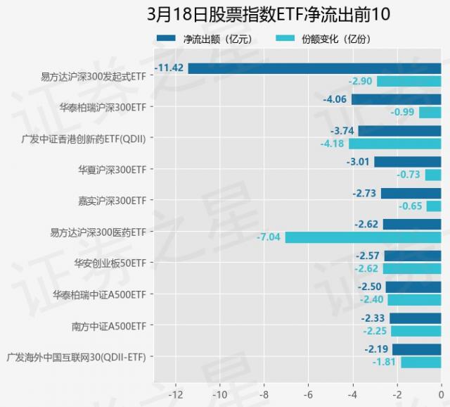 当天有 363 只股票指数 ETF 资金净流出出现在基金中,其中E基金净流出排名第一。 300 发起式 ETF(510310),份额下降 2.9 一亿份,净流出额为 11.42 亿元。