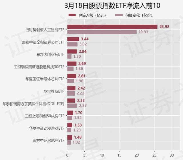 当天有 213 只股票指数 ETF 资金净流入显示,其中博时科技创新板人工智能排名第一。 ETF(588790),份额增加 19.93 十亿份,净流入额为 25.92 亿元。