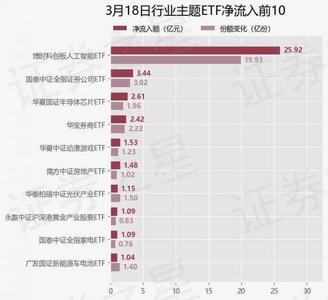 当天有 123 只行业主题 ETF 资金净流入显示,其中博时科技创新板人工智能排名第一。 ETF(588790),份额增加 19.93 十亿份,净流入额为 25.92 亿元。