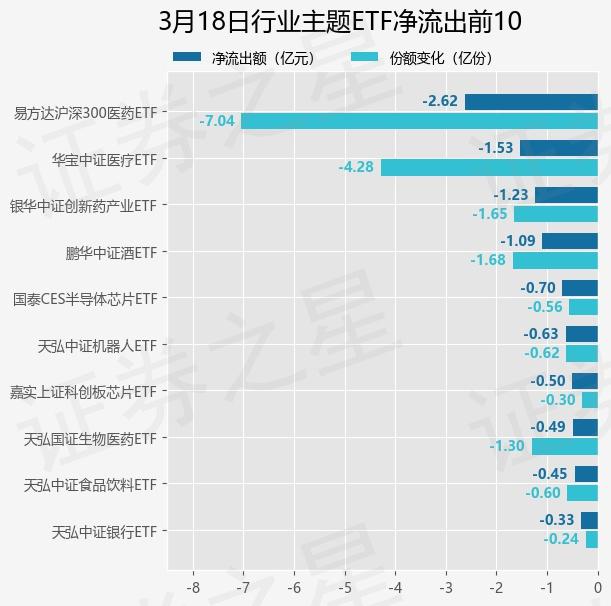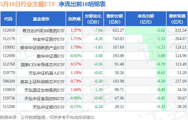 当天有 163 只行业主题 ETF 资金净流出出现在基金中,其中E基金净流出排名第一。 300 药业 ETF(512010),份额下降 7.04 一亿份,净流出额为 2.62 亿元。