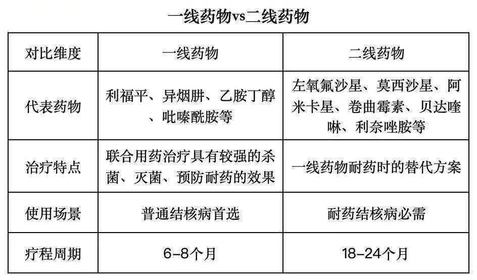 1.一般结核患者常用一线抗结核药物联合治疗,疗效好,不良反应少,治疗周期一般为6-8个月;耐药结核患者应根据抗结核药物敏感性试验结果选择敏感二线药物进行联合治疗。与一线药物相比,价格更高,副作用更大,最长治疗周期为18-24个月。