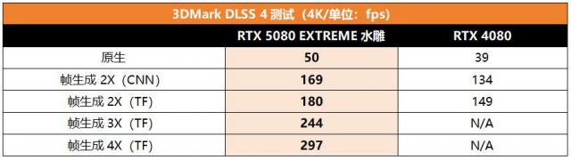 3DMark DLSS 4 功能性测试部分,RTX 5080 EXTREME 水雕在使用 TF 模型 DLSS 4 下打开 4 ×、3 × 和 2 × 帧生成,各自相对原生帧率提高 494%、388% 和 提升幅度很夸张,259%。但在 2 × 在帧生成下使用 TF 相对使用模型 CNN 模型也有 6% 的提高。如果跟 RTX 4080 使用 2 × 帧生成(CNN 与模型相比,RTX 5080 XTREME 水雕在 4 × 帧生成下的帧率要领先。 121% 之多。