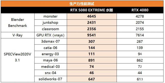 在主流 3D 软件测试中的设计工具,RTX 5080 EXTREME 水雕领先 RTX 4080 最大限度超过 20%,平均领先范围达到20% 10%。对于 3D 对于设计者来说,RTX 5080 EXTREME 水雕也的确是更有效率的解决方案。当然,如果添加了这些软件, DLSS 4 支持,然后在实时预览的时候 RTX 5080 XTREME 水雕的优点至少翻了一番。