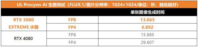 RTX 5080 XTREME 原生水雕支持 FP4 精确度计算,因此是相应的。 AI 相对用于计算 FP8 效率更高,显存占用率更低。从测试中可以看出,RTX 5080 EXTREME 水雕在 FP4 模式中相对 FP8 出图速度几乎翻了一番, RTX 4080 因为不支持 FP4 方式,在 FP4 与出图效率几乎相比,模式下的出图效率 FP8 方法慢了一半,更是只有一半, RTX 5080 FE 在 FP4 模式下的 23%。可以看出,对于需要高效的需求 AIGC,而且对于精度等级不那么严格的客户,RTX 5080 XTREME 显然,水雕是一种比上一代效率更高的升级方案。