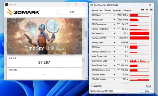 我们将 RTX 5080 XTREME 整板水雕功率上升 25% 来到 450W 水平,然后经过调整,最终实现 3307 MHz 的极限 GPU 频率,显存也超过了 3DMark32000Gbps TimeSpy GPU 分数也提高到了 37287 分数(瞬间最高整板功率释放达到 466.8W),相对公版 RTX 5080 的 32762 分数提高了大概 14%,这个幅度可以说是非常惊人的。