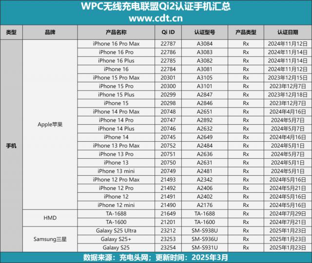 根据我们同行的充电头网, WPC 官网整理了 Qi2 到今年为止,手机汇总清单 3 月亮,除了苹果的支持 Magsafe 全线支持设备 Qi2 之外,支持 Qi2 只有安卓制造商 HMD 和三星。