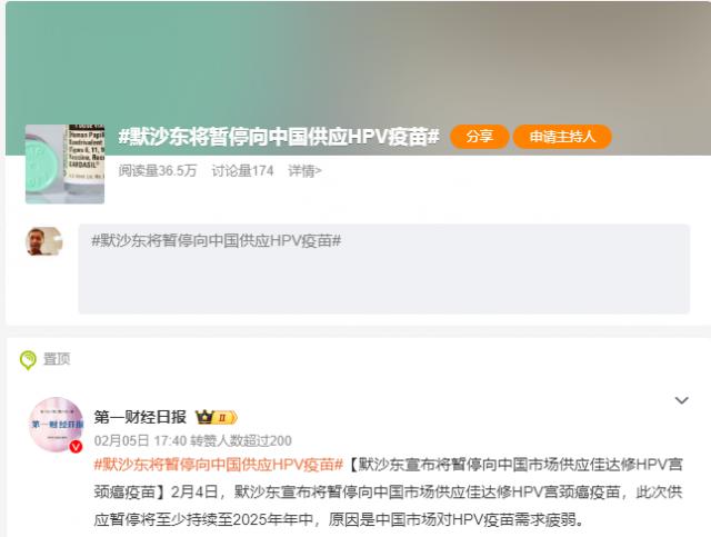 ◎ 默沙东九价 HPV 疫苗进入中国市场后,曾经供不应求,现在有消息称市场需求疲软,供应暂停。/ 图片:微博截图