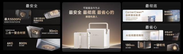 至于擦窗的场景,这次出现的智能擦窗机器人 C1 系列提供了 5500Pa 吸力结合智能气压补偿技术,配备三级行星齿轮、四轮双驱动系统和无刷永磁电机,确保产品能够在玻璃上吸收并平稳爬行。工作时,它可以通过水脉喷洒技术实现全面覆盖和对称的湿擦拭,还强调边角覆盖和更好的工作效率。