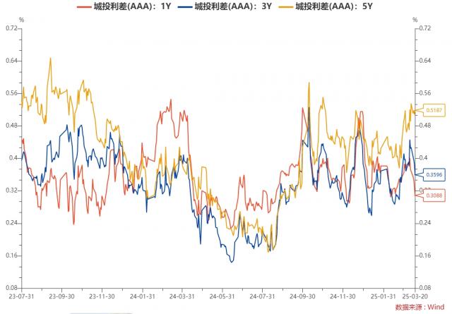 5. 最近城投债(AAA)每个期限的利差走势和数据。