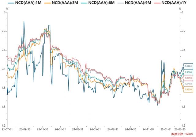 全国及主要股份制银行一年期同业存单二级市场最新交易 1.95% 周围环境,明显低于前一天。