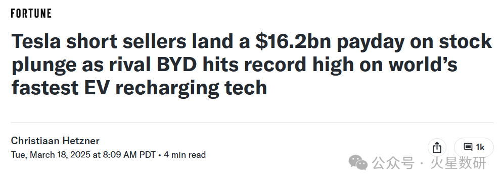 3 月 18 日,《FORTUNE》报道称,由于最新的创新,特斯拉最大的竞争对手比亚迪的市值创下了近1600亿美元的历史新高,埃隆·马斯克特斯拉汽车的股价持续下跌也让特斯拉空头赚了不少钱。马斯克的政治观点似乎正在损害他的业务,因为“买特斯拉的人不是穿牛仔靴的人”。