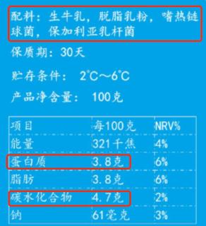 建议大家在购买酸奶时注意营养成分表和成分表,关注三个成分指标,即蛋白质含量、碳水化合物含量和成分表。
