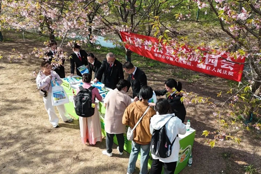 3月19日,春天充满了阳光。作为全市第一个生态环境司法保护基地,岳塘区七星村樱花园樱花盛开,吸引了众多游客前来赏花。湘潭市中级人民法院和岳塘区人民法院在这里举办了一场独特的园林活动。