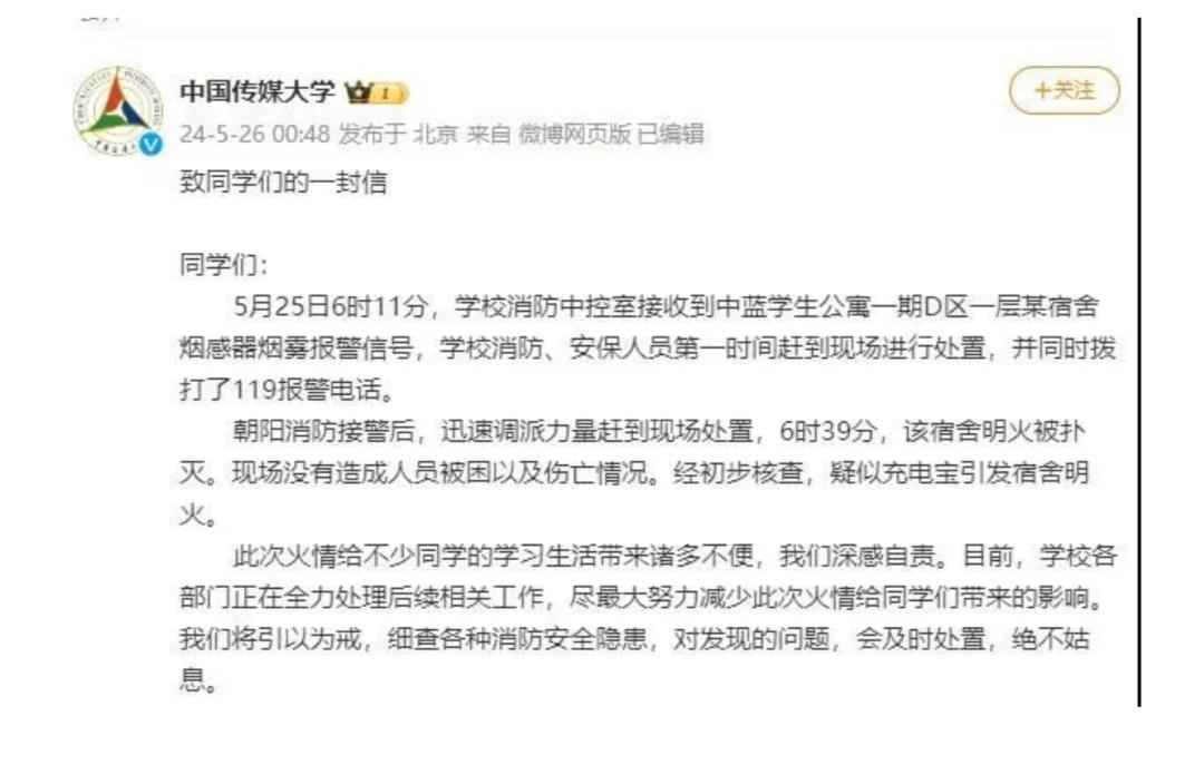2024年5月25日6时11分,中国传媒大学某学生公寓突发火灾。中国传媒大学当天发布微博报道称,火灾涉嫌充电宝引发宿舍明火。