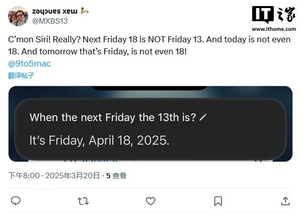 IT 世家 3 月 21 每天的消息,在答不上“现在是什么时候?”这个问题之后,Siri 再一次曝光无法正确计算日期。科技媒体 9to5Mac 昨日(3 月 20 日本)发布博文,报道称 Siri 不能回答“下个星期五” 13 这个简单的问题是什么日子?”