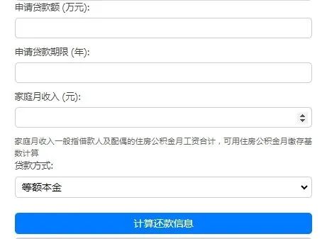 根据家庭月收入、公积金余额、房价、面积等信息,可以快速计算贷款额度。支持两种类型的家庭类型:“单一存款员工”和“双重存款员工”。