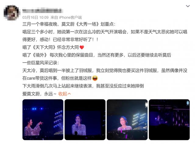 看到莫文蔚敬业的表演,观众纷纷给她留言:“我甚至没有回过神来。你摔倒了,舞台适应能力太强。”“下雨了。 在舞台上,我们真的需要多加注意。看到你以后的表演,我知道你的身体很好。“这真是一个完美的场景。虽然天气不好,但我们在音乐会上非常热情。”...