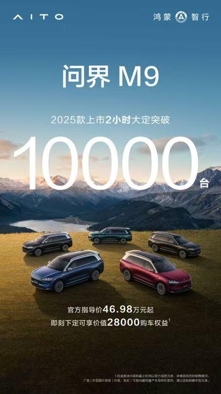 在 50 万级奢华 SUV 中,问界 M9 战斗力爆表,根据最新动态,新问界 M9 售价 46.98 万元起,打开大定 2 订单突破一小时 10000 台。