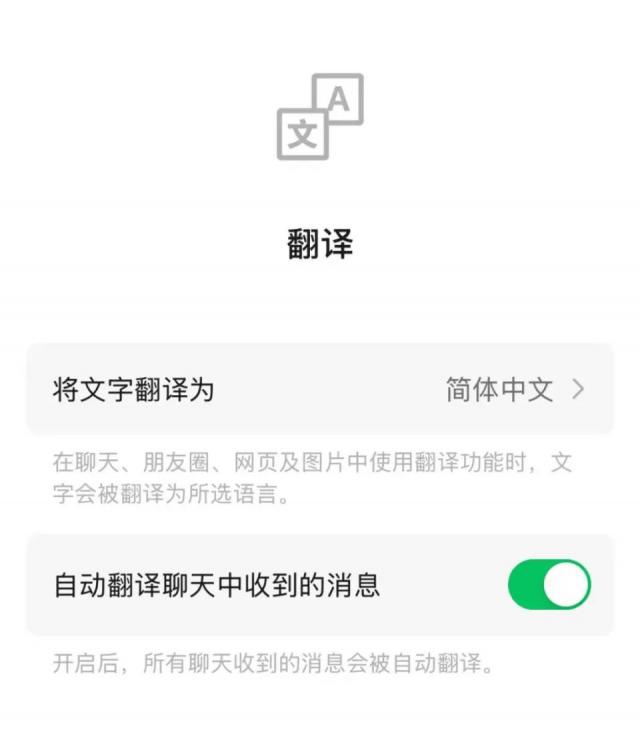 在“我-设置-通用-翻译”中打开“自动翻译聊天中收到的信息”,所有外语信息将自动转换为预设语言(如中文),无需手动操作。