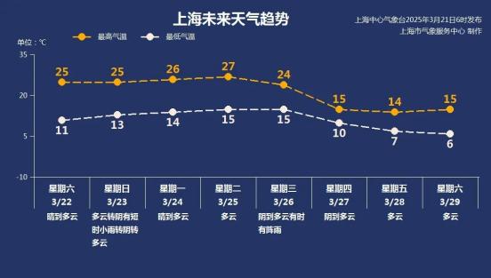 三月二十二日(星期六):晴朗到多云,11~25℃