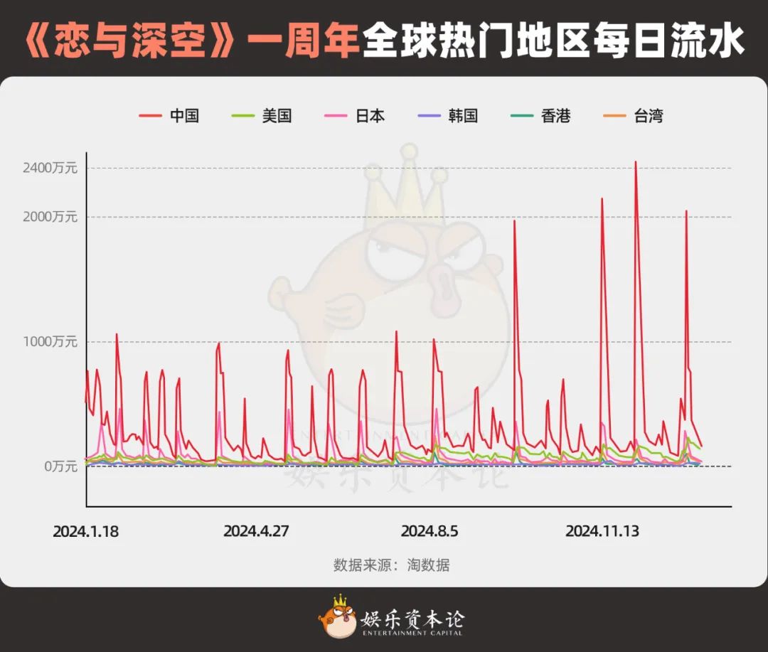 在游戏玩法方面,除了《爱与深空》加入了比较重的战斗玩法,让人感觉新鲜之外,其他恋爱女性的游戏玩法几乎和2018年《爱与制作人》刚刚诞生没有太大区别。这可能也是《爱与深空》虽然流水下降,但整体数据依然强劲,与其他同类型游戏拉开了立场的原因——这才是真正吸引新客户的原因。