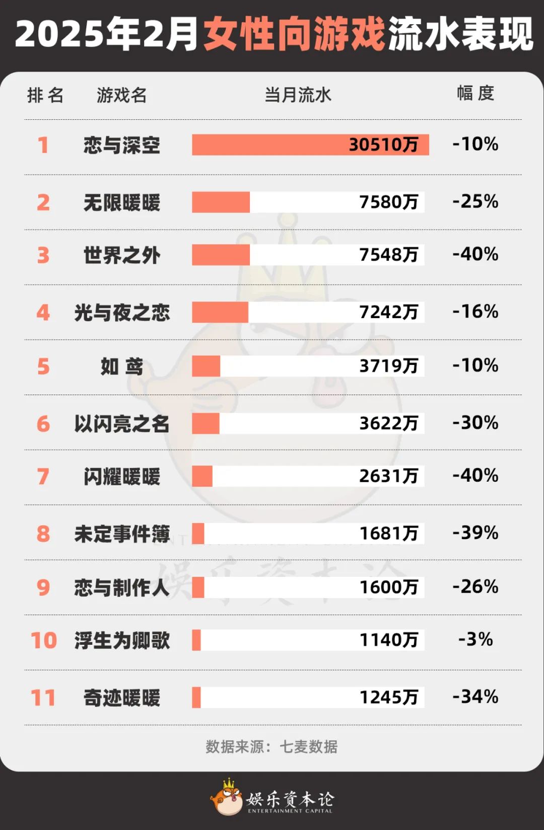 去年,以《爱与深空》为首的一批新游戏大踏步前进,打破了品类天花板。然而,今年的增长势头开始放缓。娱乐资本理论查询了今年1-2月女性的流水情况后,发现一些游戏,比如1月份的《光与夜之恋》,依然可以通过春节活动提升一波流水。到二月份,无论是乙女类还是改装类流水全线飘绿,在一月份已经表现平平的基础上,又一次下滑。