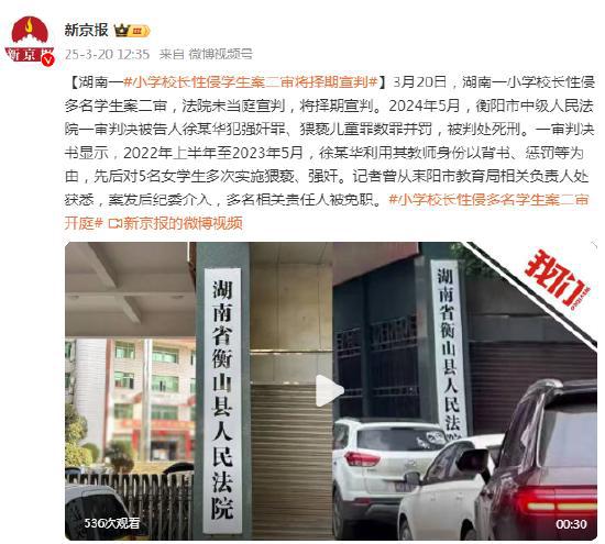 3 月 20 日本,湖南某小学校长对多名学生进行性侵二审,法院未当庭宣判,将择期宣判。2024 年 5 月,衡阳市中级人民法院一审判决被告徐某华犯强奸罪、猥亵儿童罪并处死刑。根据一审判决,2022年 年上半年至 2023 年 5 月亮,徐某华利用自己的教师身份,以背诵、惩罚等为由,先后对其进行了回应。 5 有名的女学生多次实施猥亵、强奸。记者曾从淞阳市教育局相关负责人处了解到,事件发生后,纪委介入,多名相关负责人被免职。# 小学校长性侵多名学生案二审开庭。 #
