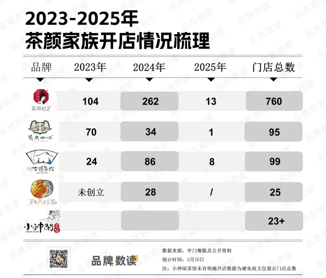 品牌数量梳理了过去几年茶叶家族的开业情况。从开店数量来看,现代中国茶叶店仍然是主力军。过去几年开了360多家店,保持了不断扩张的趋势。