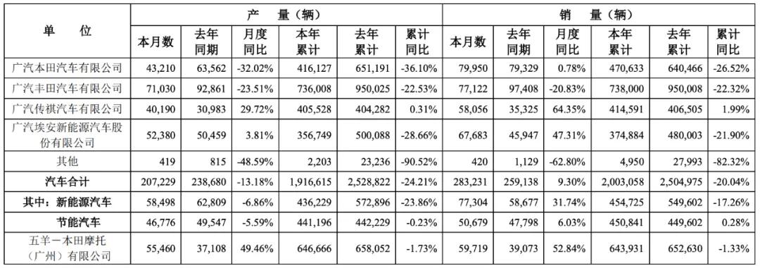 根据广汽集团今年1月初发布的产销快报数据,2024年12月,其累计销售额为200.31万辆,比去年同期下降20.04%,其中新能源汽车45.47万辆,比去年同期下降17.26%。
