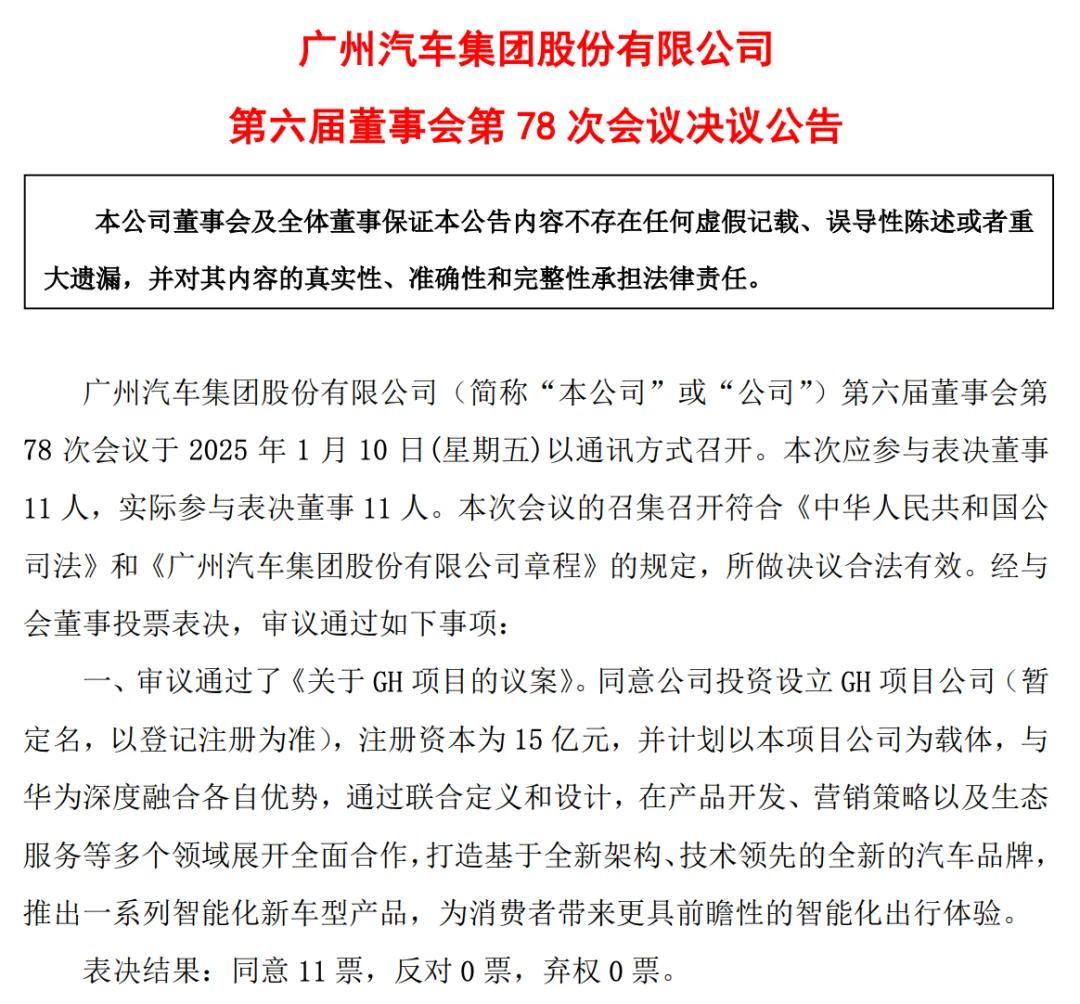 2025年1月10日,广汽集团再次宣布,公司第六届董事会第78次会议审议通过了《关于GH项目的议案》,同意公司投资设立GH项目公司(以注册为准),注册资本为15亿元。