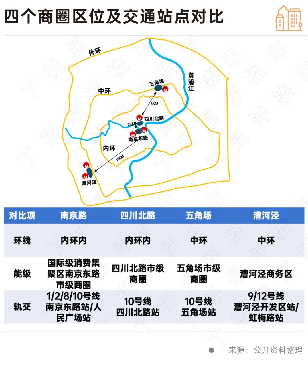 四大商业区(区域)均位于内环或中环,轨道交通便利,具体对比如下图: