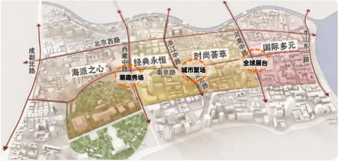 南京路步行街区功能规划图(四大功能分区 三大转承场景)