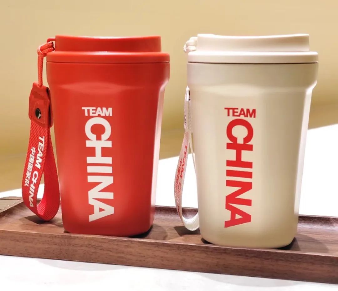 同样是体育文化衍生品,TEAM CHINA国家队的杯子也成了「社交货币」。酷炫的竖板正红色标识饮水杯,加上同色LOGO挂扣,占据了不少消费者的视野。