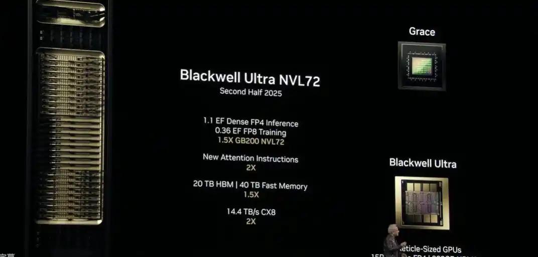 对黄仁勋来说,随着人工智能的发展,推理将成为未来十年最重要的工作量之一。英伟达在会上正式发布了Blackwelll。 包含GB3000的Ultra芯片 NVL72机架级解决方案和NVIDIA HGX B300 NVL16系统。基于当前的Blackwell架构,Blackwell 与上一代产品相比,Ultra的AI性能有望提高1.5倍。Blackwell架构已经全面投产,新产品Blackwellll Ultra NVL72有望在今年下半年发货,NVLink72 与Hopper相比,Dynamo的推理性能提高了40倍。另外,英伟达透露,2026年下半年将推出下一代Rubin架构芯片。