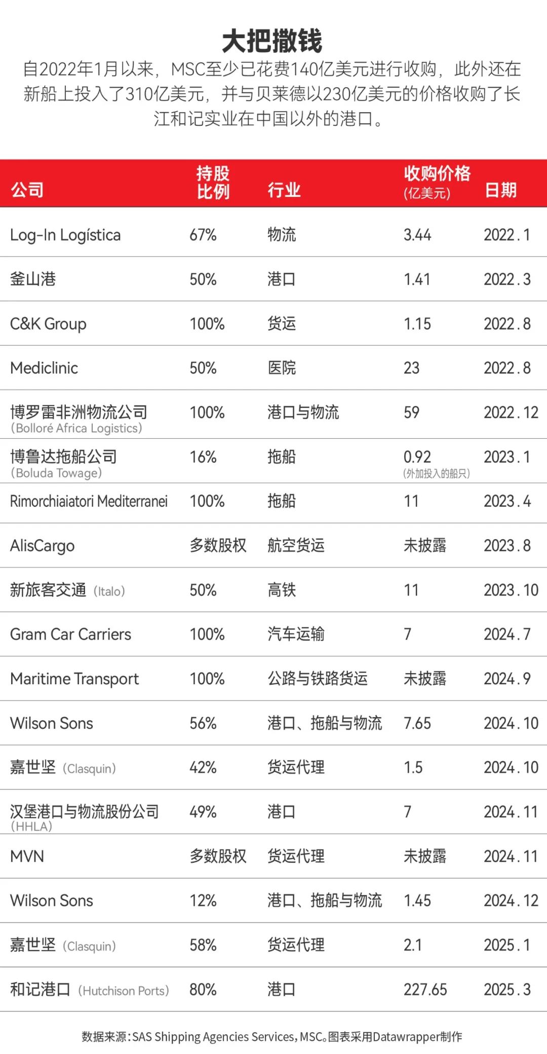 MSC在2022年3月收购了韩国釜山港50%的股份,8个月后,它又以59亿美元从法国亿万富翁文森特·博罗雷获得了59亿美元。(Vincent Bolloré)博罗雷集团收购了博罗雷非洲物流公司(Bolloré Africa Logistics),该公司提供集装箱码头、陆港、铁路和物流服务。这次收购使MSC成为非洲最大的物流公司和世界第七大港口所有者。去年十一月,德国上市物流公司汉堡港口和物流有限公司以7亿美元的价格收购(HHLA)该公司在汉堡、爱沙尼亚、意大利和乌克兰敖德萨拥有49.9%的股权。