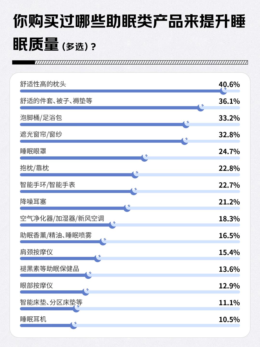 根据JD.COM消费和产业发展研究院的调查,41.3%的人选择舒适度高的枕芯让自己“睡个好觉”,36.6%的人选择舒适的四件套、被子等。,31.2%的人选择遮光窗帘或窗纱。JD.COM数据显示,2024年,酒店睡觉床垫成交额同比增长100%以上,智能床垫成交额同比增长80%,软管枕和记忆枕成交额分别增长159%。、77%。