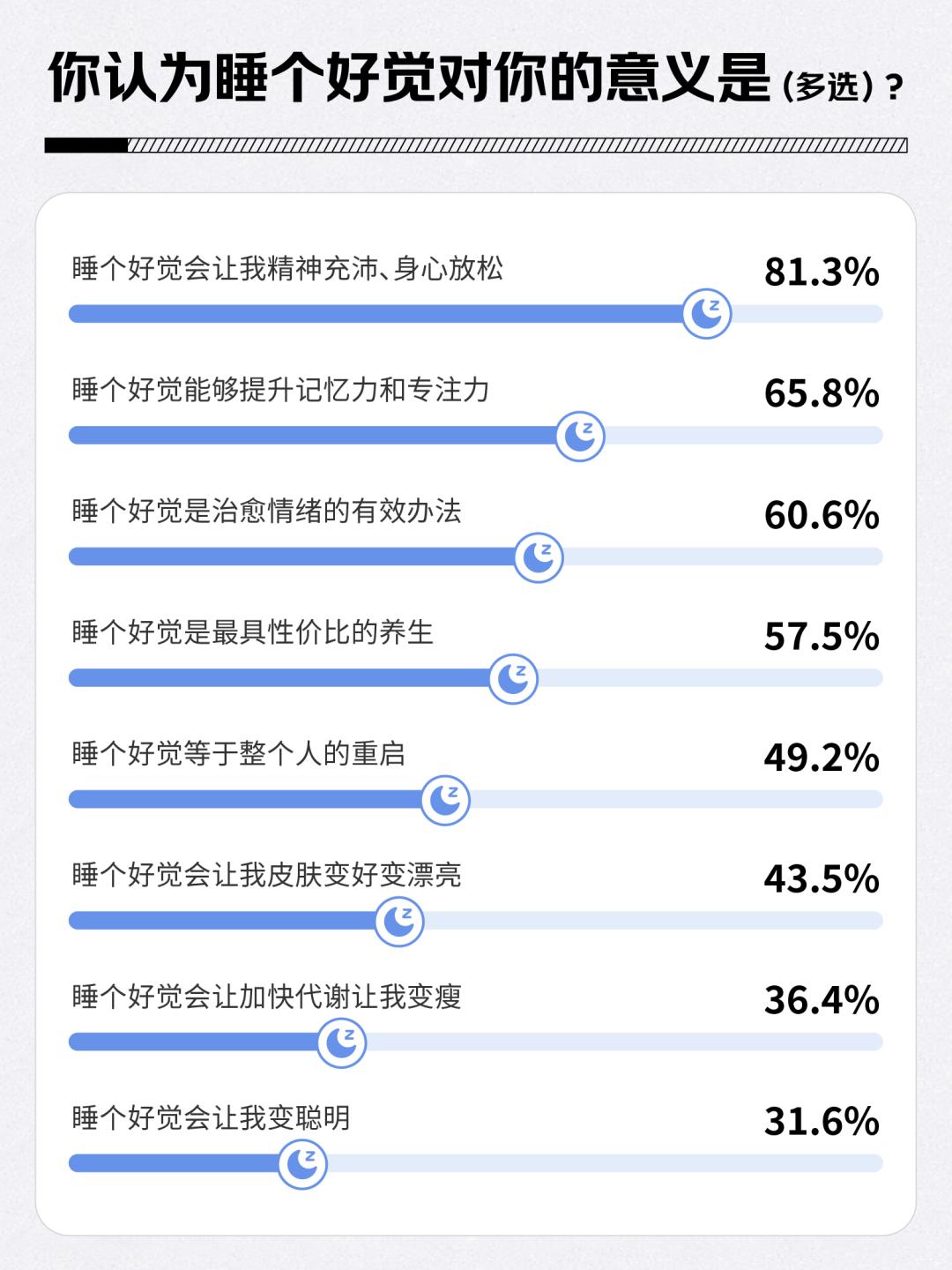 在他们看来,“睡个好觉”就像一种全方位的解药:81.3%的人认为“睡个好觉”可以让人精力充沛,身心放松,65.8%的人认为可以提高记忆力和专注力,治愈情绪(60.6%)。、性价比最高的养生(57.5%)、整体重启(49.2%)也是“睡个好觉”带来的积极价值。