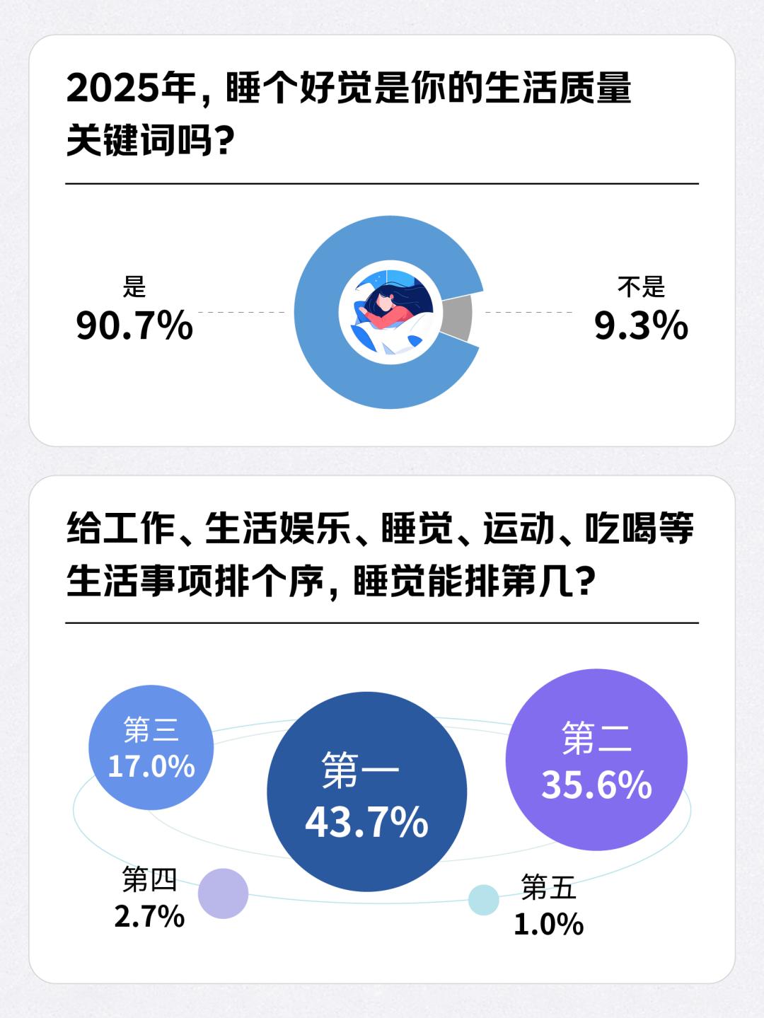 90%的成年人把“睡个好觉”作为2025年生活质量的关键词。超过4个成年人将睡眠排在第一位,35.6%的人将睡眠排在第二位。