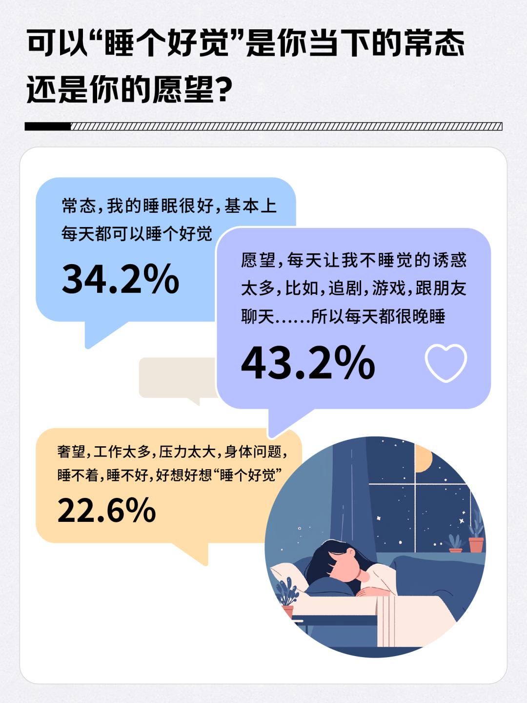 在JD.COM消费和产业发展研究院的调查中,43.2%的人表示“睡个好觉”是一种愿望。“每天让我不睡觉的诱惑太多了,比如追剧、玩游戏、和朋友聊天...所以我每天睡得很晚。”22.6%的人认为这是一种奢侈。“工作太多,压力太大,身体问题,睡不着,睡不好,想睡个好觉”。