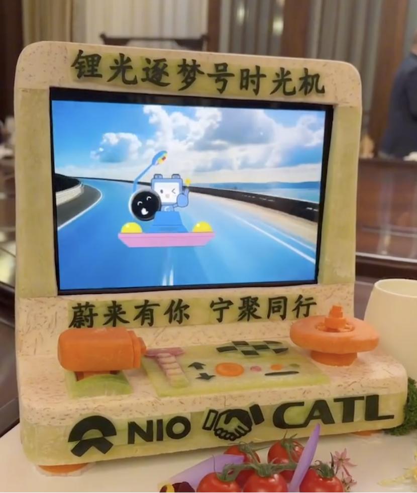 在与当代安普瑞斯科技有限公司签订电力交换协议后的晚餐上,曾毓群精心准备了一台由山芋、冬瓜和萝卜制成的“锂光梦时光机”,这被李斌解读为双方的合作,一定会“脚踏实地,种下坚实的果实。”