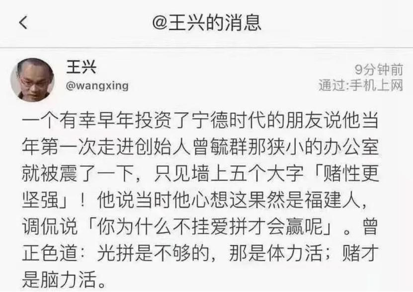 这种游戏心态在宁德时代和曾毓群身上也很明显。美团创始人王兴,也是福建人,曾在自己的饭否上回忆道:一个早年有幸投资宁德时代的朋友说,他第一次走进创始人曾毓群狭窄的办公室,被震惊了。他看到墙上五个字“赌得更厉害”!他说他当时觉得这真的是福建人,调侃道:“为什么不爱打架就赢?”曾正色道:“光拼是不够的,那是力气活;赌博是脑力活。”