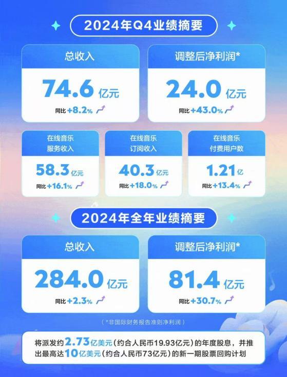 2024年第四季度和全年财务报告显示:2024年,腾讯音乐全年总收入为284亿元,同比增长2.3%,调整后净利润为81.4亿元,同比增长30.7%。其中,在线音乐业务持续增长,年订阅收入同比增长25.9%至152.3亿元。