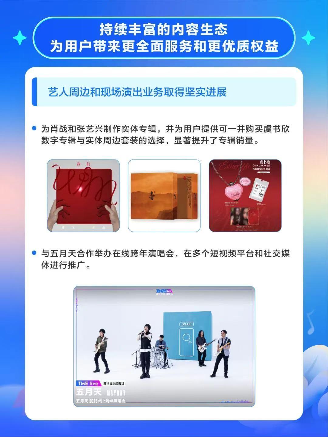 在艺术家周边和现场表演业务中,为肖恩和张艺兴制作实体专辑,为用户提供绑定购买选项的虞书欣数字专辑和实体周边,显著增加专辑销量;与五月天合作举办线上跨年演唱会,借助多个短视频平台和社交媒体进行宣传,吸引大量用户观看,打造优秀音乐活动,大大增强了客户对平台的粘性和归属感。