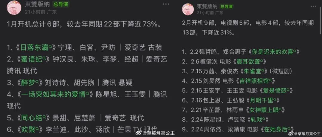 近日,影视寒冬成为剧圈、粉圈共同热议的话题,有网友盘点了今年前两个月启动的长剧项目——1月启动了6部,比去年同期的22部减少了近73%。;二月份只启动了5台,比去年同期下降了近31%。