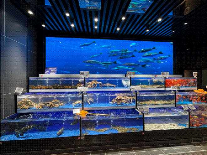 在水产品方面,西北地区很少有这么丰富的商品组合。帝王蟹、波士顿龙虾、珍宝蟹、鲟鱼、三文鱼、鲈鱼、草鱼、鲫鱼等。中高档和低档的水产品非常丰富。举例来说,帝王蟹是空运的,从上海到商店只需10个小时;鲈鱼也是广州佛山千里之外的产地。并且大部分品类都属于“吊水鱼”,每条鱼都有一个二维码,可以扫码追溯,包含食品检验报告。