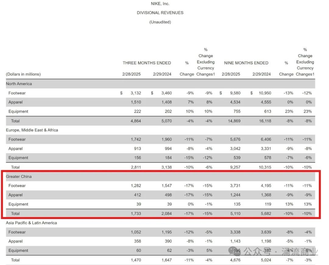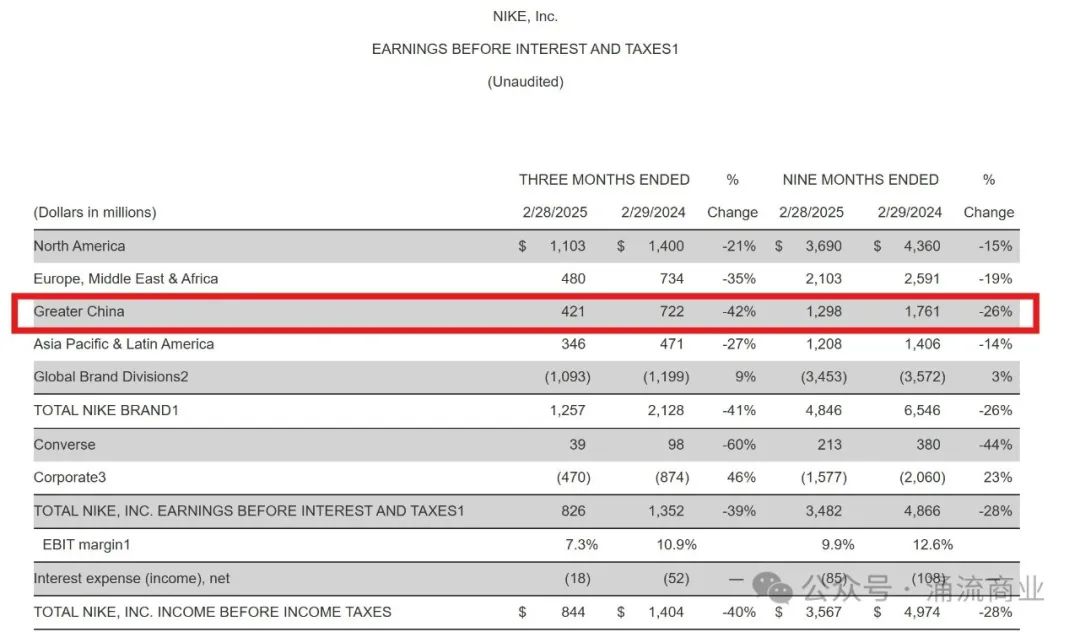 耐克大中华区第三季度状态不佳:营收17.33亿美元,比第二季度的17.11亿美元有所改善,但比去年同期的20.84亿美元下降了15%(基于货币中性);EBIT息税前利润同比下降42%。