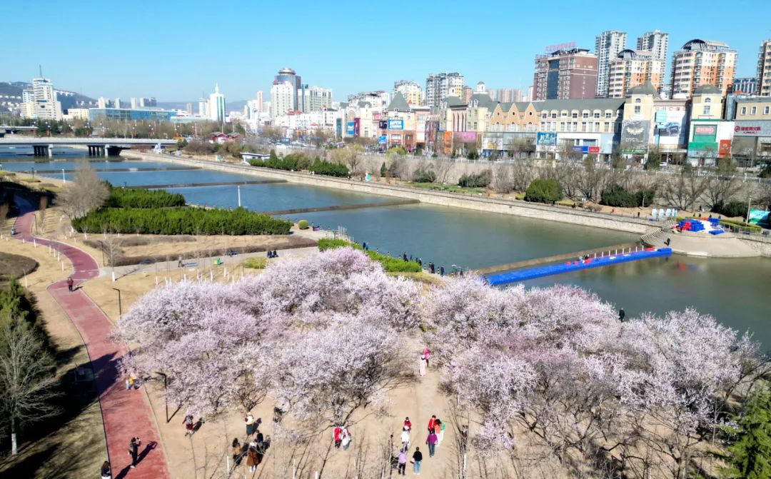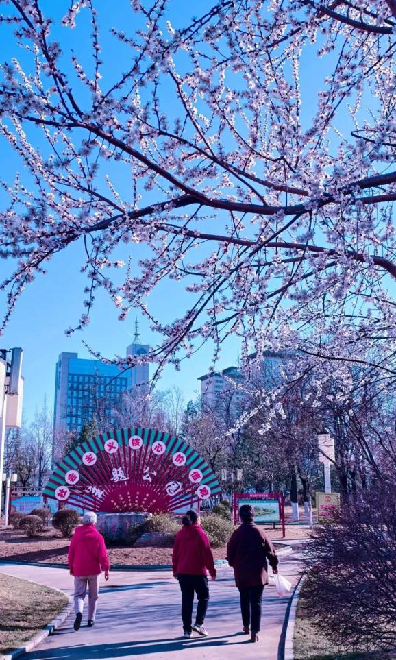 桃花盛开,城市中心公园梅花盛开,香岛公园枝叶迎春…市民漫步其中,享受休闲时光。