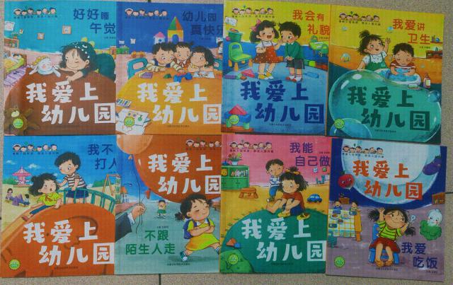 我家的绘本是“我爱幼儿园”这个绘本,它有一套 8 本,包括 16 一个小故事,包括教孩子午睡和吃饭,礼貌,卫生,交朋友,调节情绪,保护自己,教育孩子幼儿园有哪些有趣的游戏,真正让孩子爱上幼儿园。