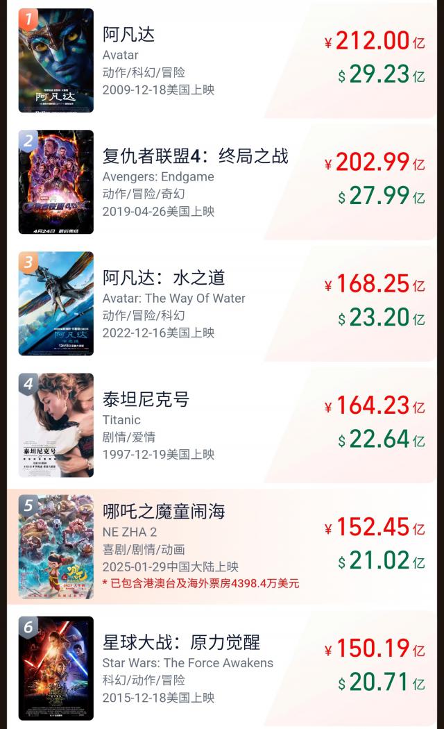 今年春节档上映了《哪吒的魔童闹海》,昨天官方宣布将增加上映至上映。 4 月 30 日,以前曾经存在过 2 月 19 日本宣布将增加上映 3 月 30 日。截至 IT 世家发稿,电影《哪吒魔童闹海》全球累计票房达到。 152.45 1亿元(包括港澳台和海外票房) 4398.4 万美金),在电影史上排名第五。